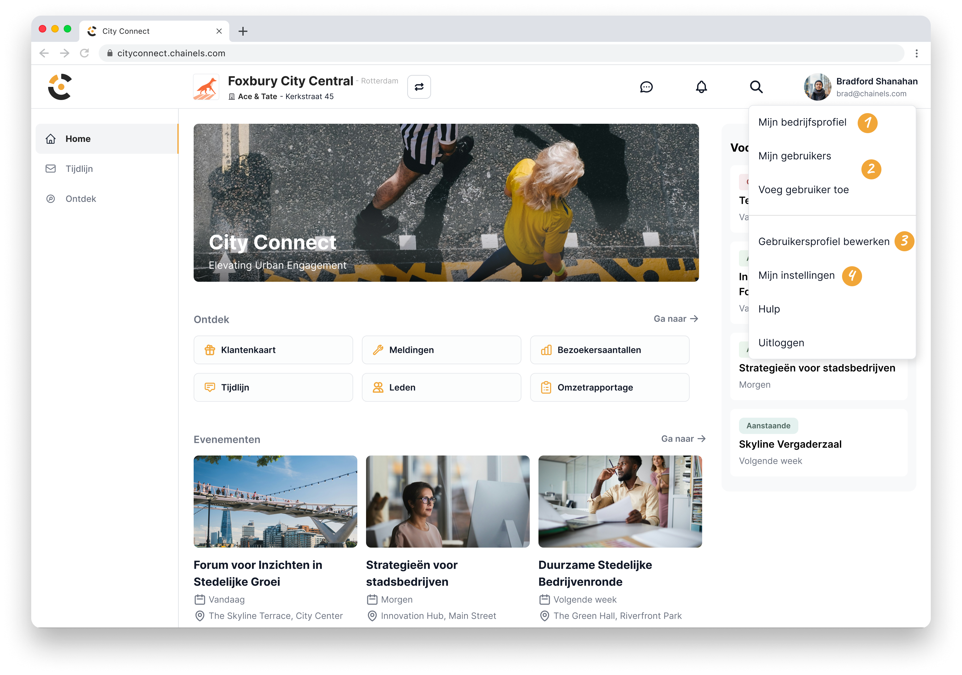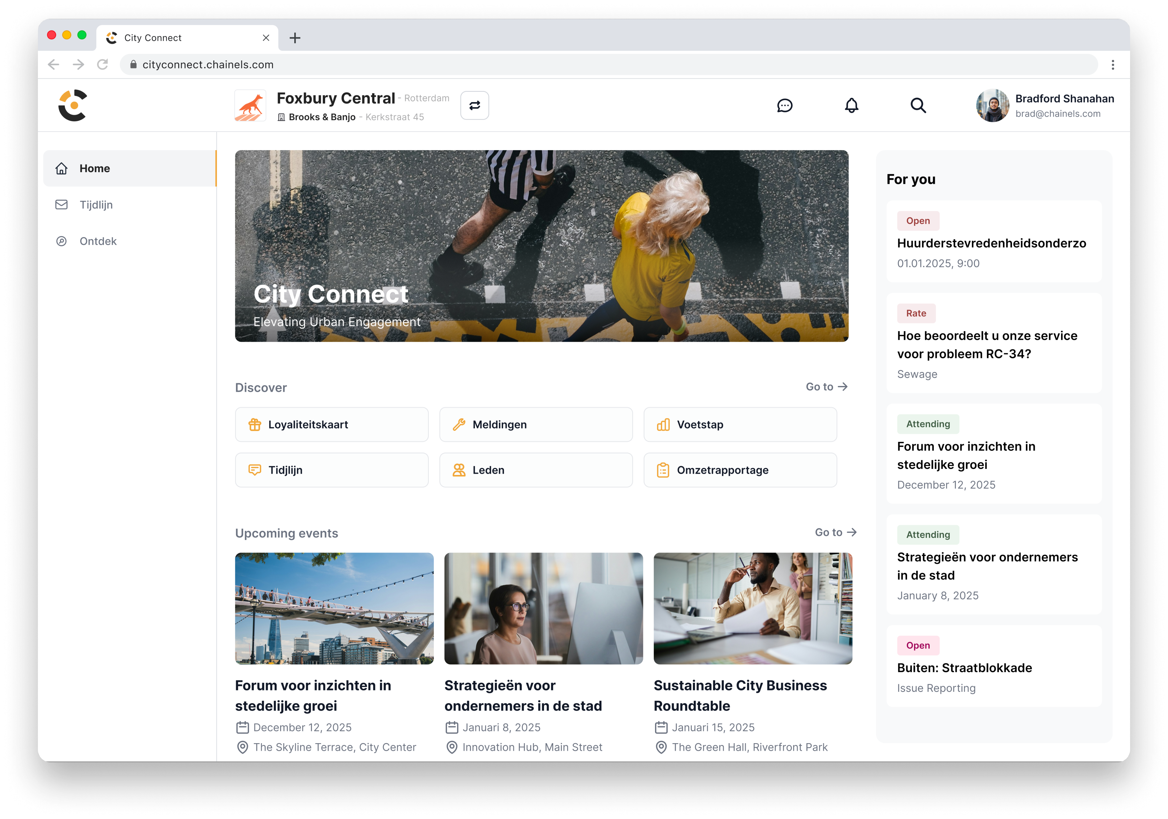 - Klik op ‘Tijdlijn’ om het hart van de community te ontdekken. Hier blijf je niet alleen op de hoogte van het laatste nieuws en evenementen, maar praat je ook actief mee door te reageren of deel te nemen aan enquêtes. Heb je zelf iets te melden, zoals een lokaal initiatief? Deel het direct met je buren of vakgenoten. Het is dé plek om informatie uit te wisselen en waardevolle connecties te leggen.Zoek ze op, werk samen en bouw zo samen een betrokken, effectieve en toekomstbestendige community op!